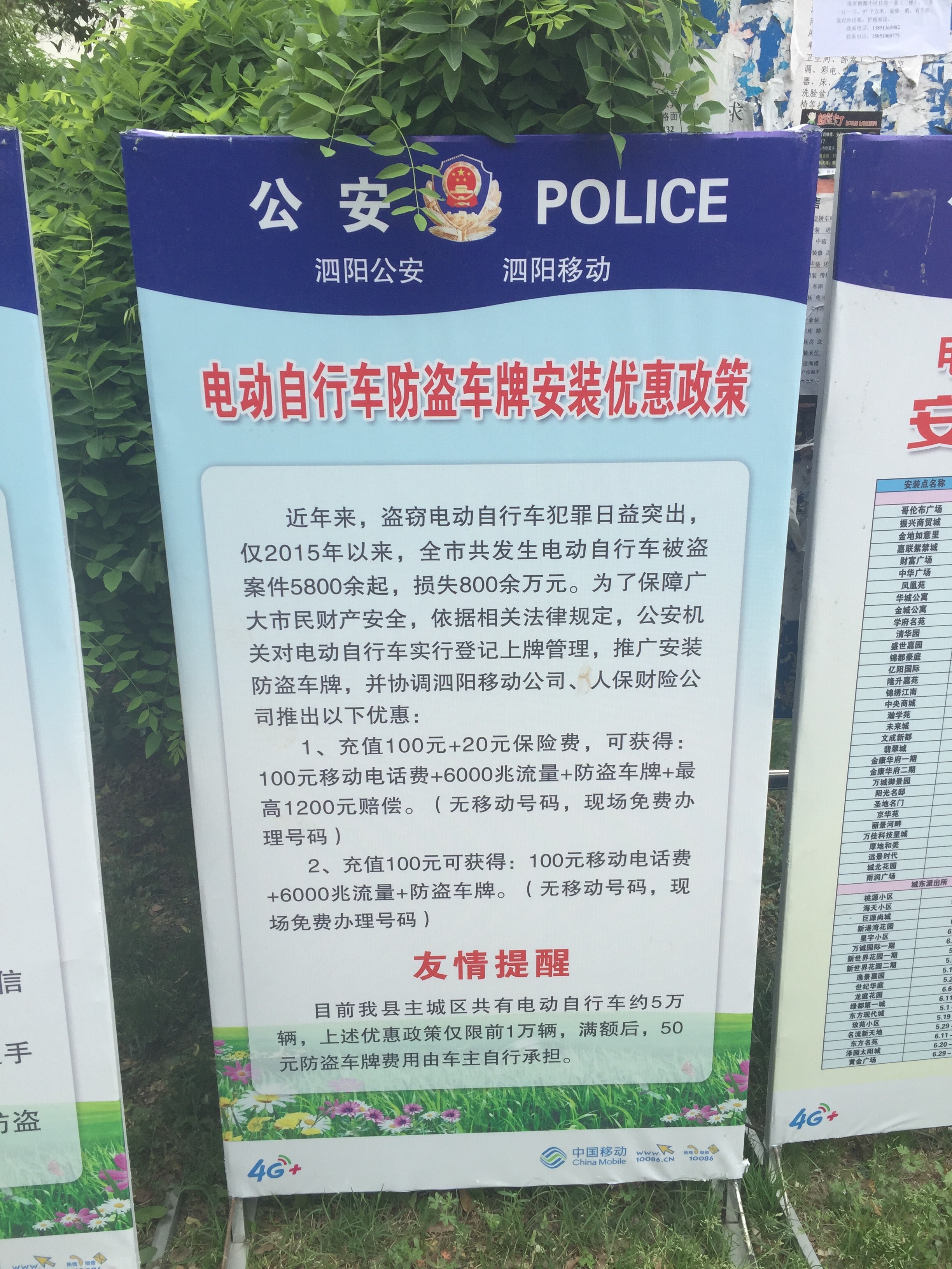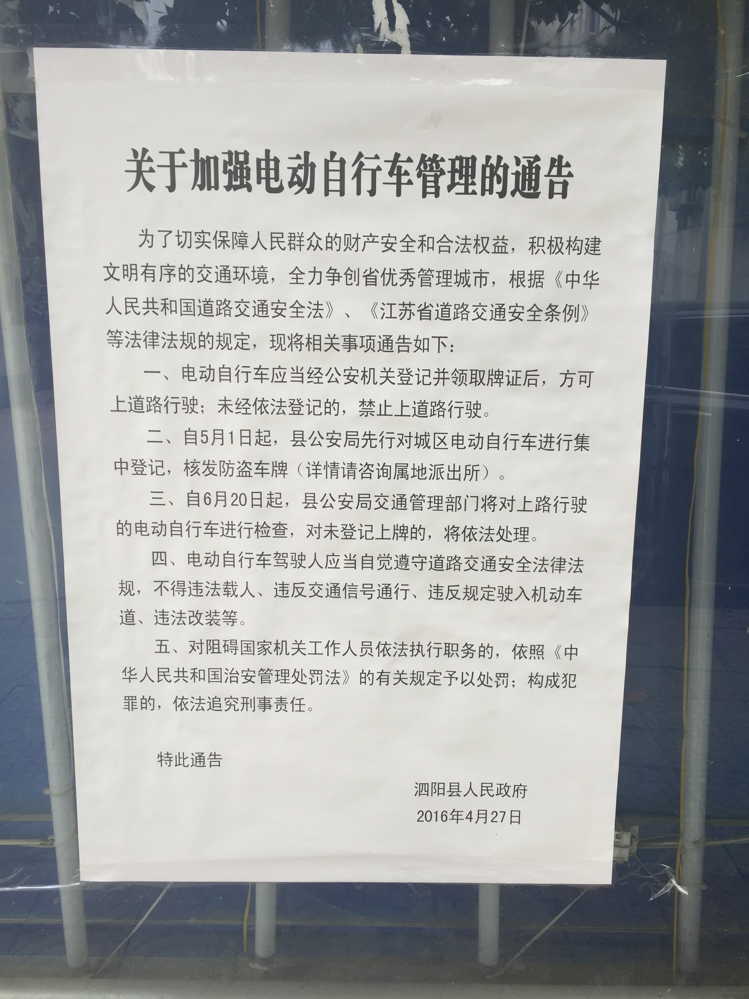 在泗阳一些小区都张贴了泗阳县人民政府《关于加强电动自行车管理的通告》,通告中指出:“自5月1日起,县公安局对城区电动自行车进行集中登记,核发防盗车牌。自6月20日起,县公安局对未登记上牌上路行驶的电动自行车,将依法处理。”从5月1日开始由各辖区派出所到泗阳各小区进行防盗车牌安装。