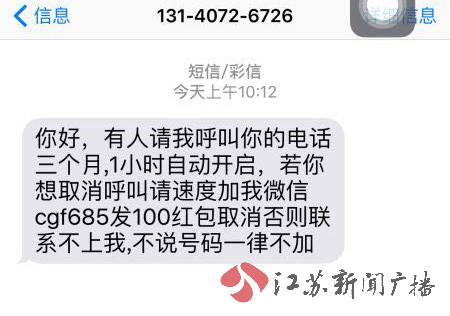 牟女士告诉记者,27号上午8点多,她的手机连续收到了4条陌生人发来的短信。这些短信的内容完全一致,只不过发送号码有所不同。记者从牟女士的手机截屏上看到,陌生人在短信中说,有人将连续三个月呼叫牟女士的电话,呼叫功能一小时后自动开启。如果想取消,请及时加微信账号“cgf685”为好友,然后向该账号发送100块钱的红包。牟女士看完短信后,断定是诈骗信息,就没有理会。可是一个小时后,牟女士的手机被陌生电话打爆了。这些陌生电话都没有显示主叫号码。