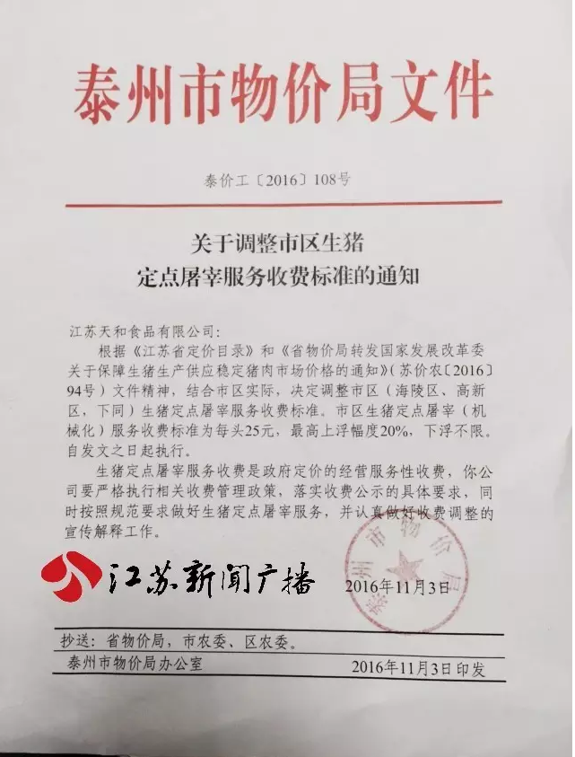 泰州市物价局2006年第35号文件明确规定,当地机械化屠宰加工收费标准为每头生猪15元。泰州市民徐伟告诉记者,作为泰州市区唯一一家政府定点的屠宰企业——江苏天和食品有限公司自2013年投产以来,一直超标准收费:“一般收费是25元一头,高的30元,到年底春节还收100的。它一直没有按照政府的指导价收费,我们对这个乱收费(有)很大的意见。”