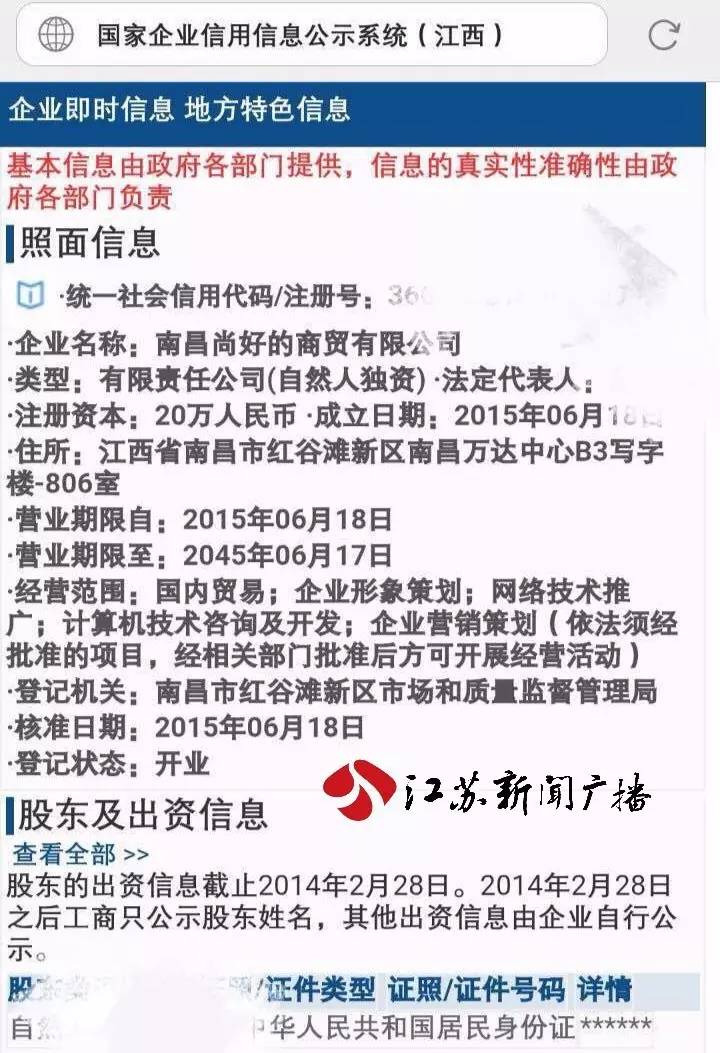 吴先生口中这家莫名出现的公司名称为“南昌尚好的商贸有限公司”,类型为自然人独资,核准日期是2015年6月18号,法定人代表显示为吴先生名字。吴先生回忆,2011年自己的身份证曾丢失补办过一次,自己的身份信息很可能被盗用。记者查询到,公司注册地址在江西省南昌市红谷滩新区南昌万达中心内,经营范围从事国内贸易,企业形象策划,网络技术推广等,随后记者拨通了公司电话试图联系,结果电话那头却回复:“你打错了,(你知道这个尚好的公司吗)不知道,我们也没听说过,(你不担心这个尚好的公司用你的号码吗)那已经很多人打了,我担心有用吗?”