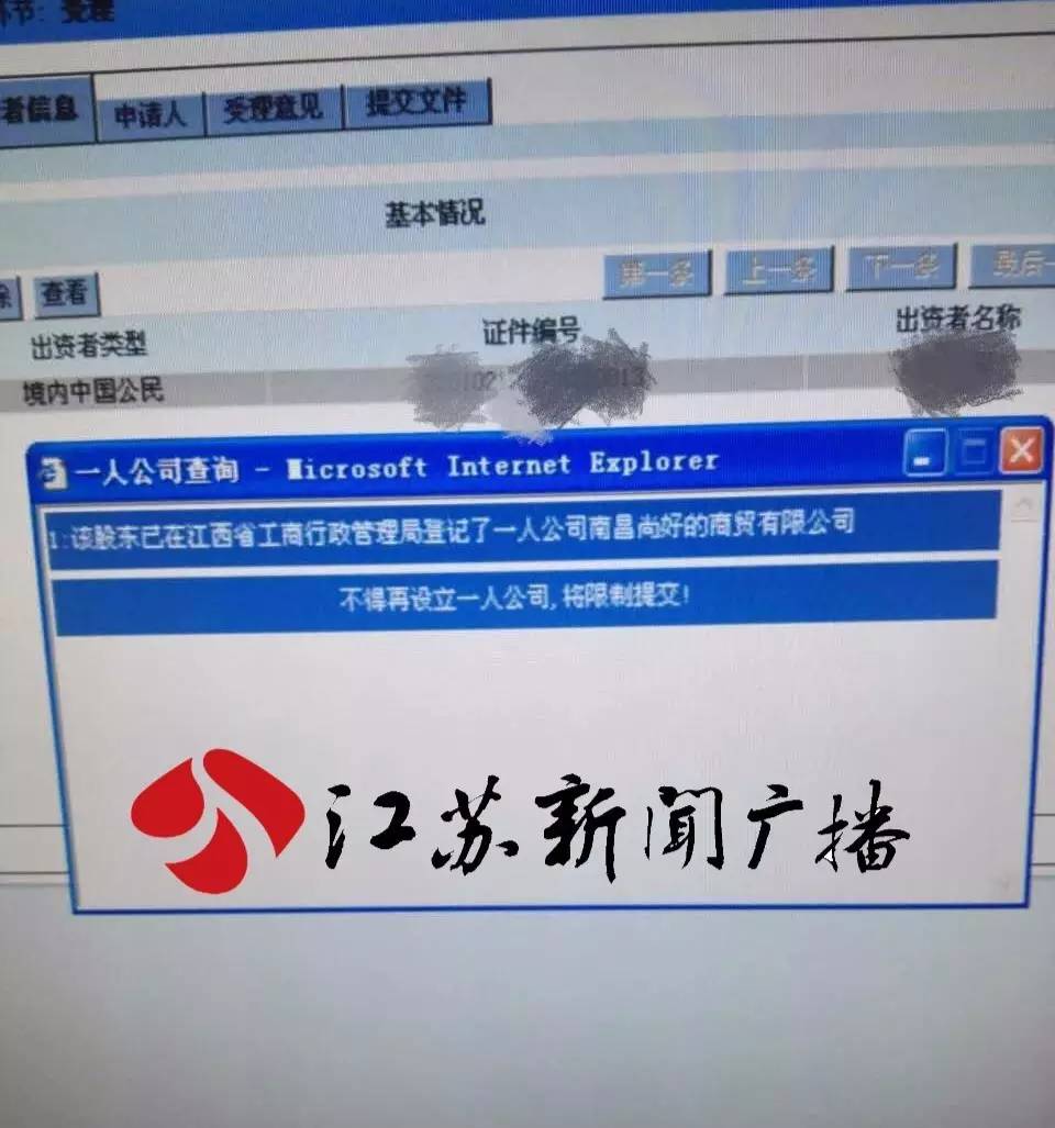 为了弄清真相,12月21号下午,记者陪同吴先生来到了南京玄武区政务中心工商登记窗口,工作人员查询后发现:吴先生确实已在江西省工商行政管理局登记了一人公司。根据我国公司法的规定:一个自然人只能投资设立一个一人有限责任公司。也就是说如果这家公司不撤销,吴先生就不能设立按自己意愿成立的公司。对此,吴先生既无奈更担忧:“万一拿这个空壳的公司去套国家的税啊,虚开增值税发票,因为他开这个票的话肯定是用我名义,如果他的企业再有一些债务,那么法人是我承担责任的还是我。”