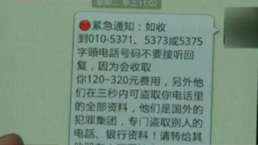 “接听回复‘5373’字头的电话会收取120-320元费用,且3秒内被盗取电话中的全部资料。”日前,这则消息开始在微信朋友圈中热传,这到底是真还是假呢?对此我们进行了调查。