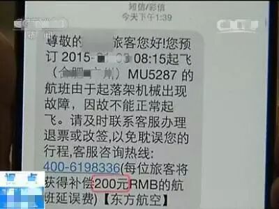 昨日,市民丁先生就在家中收到一条短信:“丁XX,您预订的航班因为台风登陆导致延误,请您尽快办理改签或者退票,为了表示歉意我们将给予300元人民币作为补偿。客服热线:4006061796。”