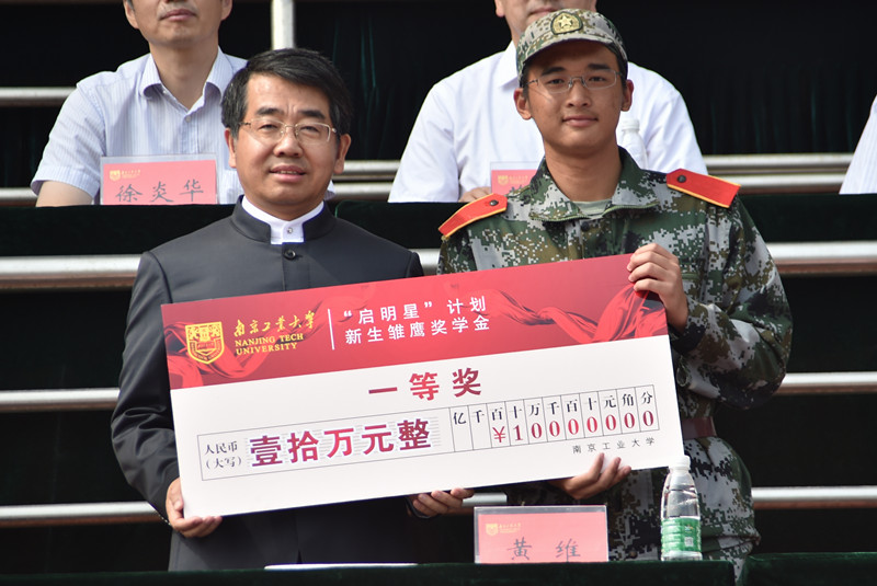 南京工业大学昨天举办了2015级本科生新生开学典礼暨军训汇报演出。在开学典礼的发言上,中国科学院院士、南工校长黄维和学生聊起了“颜值”与美,引来学生的“点赞”。更为励志的一幕是,一名来自海南的大一男生刘必进从校长手中接过了 “新生雏鹰奖学金”一等奖,获得10万元的奖学金。