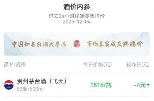 12月4日,新浪财经“酒价内参”发布全国终端价监测,整合约 200 家直营经销商、批发市场及零售网点的实时数据,显示飞天茅台终端成交均价稳定在1816元/瓶,已连续数周平稳运行。这份业内大单品价格指数已成为观察高端白酒市场最重要的参考窗口之一。