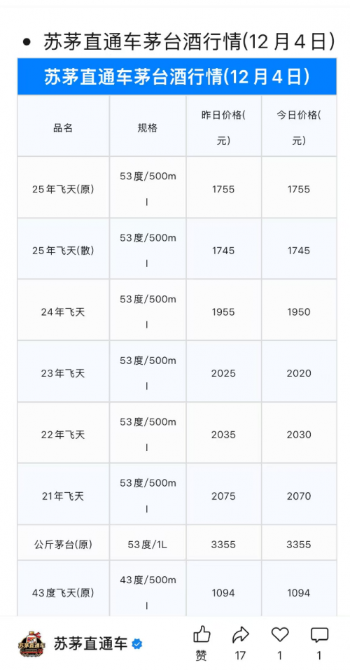 截至12月4日,江苏地区25年飞天原箱为1755元,24年飞天为1950元,市场供需关系健康;内蒙古地区25年飞天原箱批发团购参考价1750元,连续一周持续平稳;天津地区2025年飞天原箱1730元,与核心消费区形成良性衔接与呼应。这种“高地稳健、全域协同”的价格格局,虽有一定差异,但总体相差不大,是市场自发调节与品牌价值共识共同作用的结果。