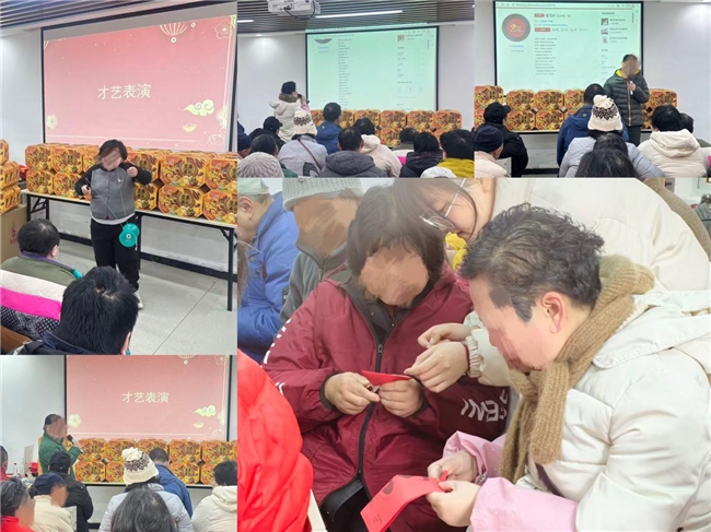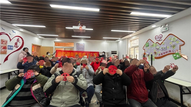 表演结束后,现场开展剪福字窗花手工活动,工作人员与志愿者耐心指导,残疾人朋友们积极参与,一张张红彤彤的福字窗花跃然纸上,不仅增添了新春的喜庆氛围,更让大家在动手体验中感受传统年俗的乐趣。活动最后,街道残疾人之家为现场参与的残疾人及家属发放新年礼包,大家合影留念,定格温馨瞬间。