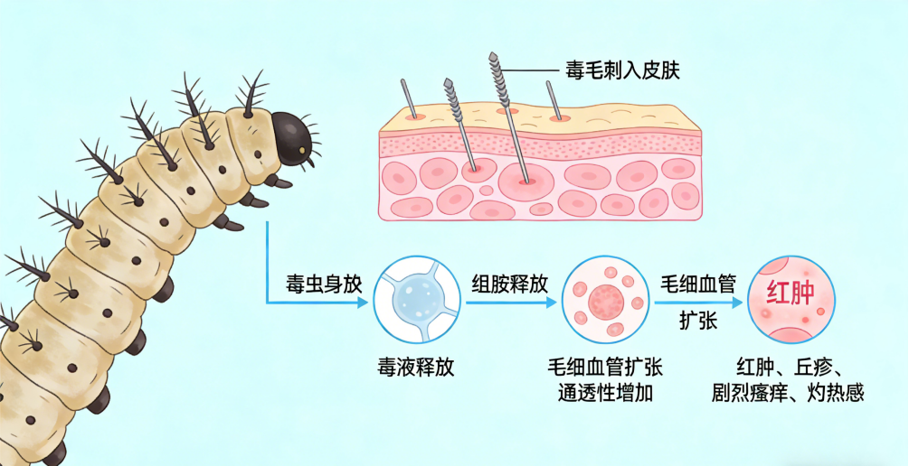 这些毒毛一旦接触并刺伤皮肤,便会释放出毒液,引起刺激性皮炎,刺激皮肤组织释放组胺等炎症介质,导致局部毛细血管扩张、通透性增加,随即出现红肿、丘疹、剧烈瘙痒和灼热感。这种痒感往往比蚊虫叮咬更为剧烈,且持续时间更长。其瘙痒症状在晚间更为严重,如果反复接触毒毛或搔抓也会加重症状。