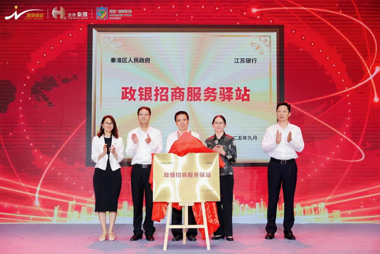 会上,秦淮区委常委、区政府副区长傅浩发布“3+X”产业基金体系。秦淮区发改委、商务局、文旅局依次对秦淮区四大主导产业招商应用场景进行发布。秦淮区政府联合江苏银行共同搭建的“政银招商服务驿站”正式揭牌。秦淮区政府副区长咸敏为秦淮区全球招商合作伙伴颁发聘书。