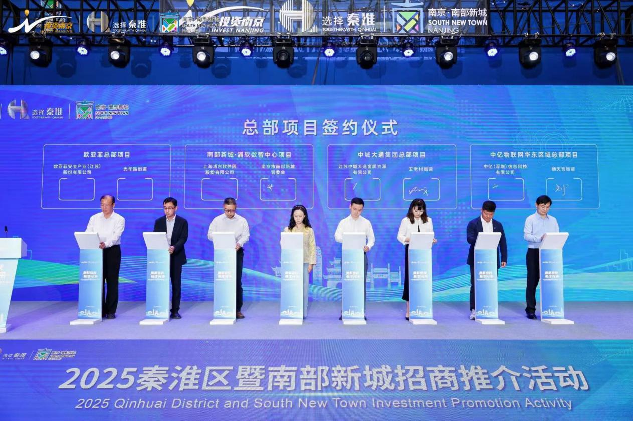 在签约合作环节,南京市场景创新发展有限公司与秦淮区政府达成秦淮区招商应用场景创新合作。中江国际集团与南部新城集团公司、秦淮区国资集团、秦淮区科创集团,共同组建了总规模达20亿元人民币的“江苏省数智低碳建筑战新产业基金”。此外,活动上还集中签约了28个产业项目,涵盖总部项目、现代金融和商贸、软件信息(人工智能)、新一代通信(物联网)、新能源和环保、大健康及教育、文旅融合等产业类别。