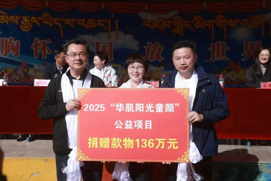 活动期间,江苏华肌阳光童颜公益探访团一行深入海南州共和县、贵南县,玉树州玉树市、称多县,平均海拔3300米,为青海高原地区儿童送去学习用品和专为高原环境研发的护肤物资,2025年捐赠款物达136万元。