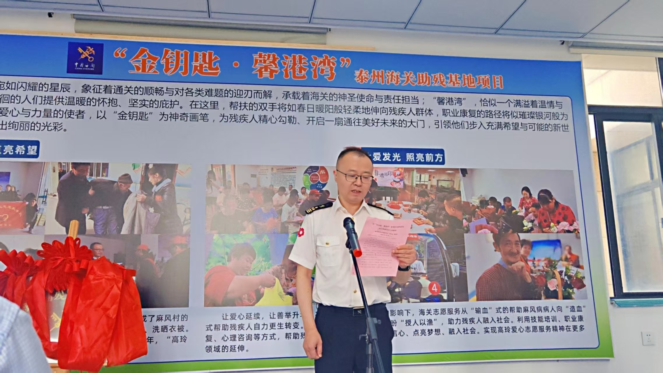 活动在热烈而庄重的气氛中拉开帷幕。仪式伊始,凤凰街道相关负责人代表街道对泰州海关、区残联以及社会各界的长期关心与支持表示衷心感谢。负责人在致辞中表示,“金钥匙”寓意着开启幸福生活的大门,“馨港湾”象征着温暖关爱的家园,基地的落成是汇聚社会爱心、赋能残疾人福祉的重要成果。