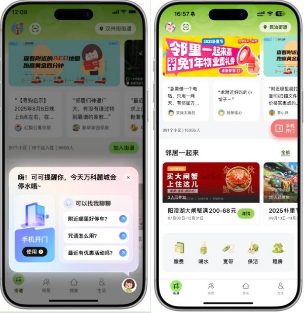 新版“住这儿”APP基于业主的刚需场景,将注册用户从万科物业业主逐步延申至街道居民,构建起一个汇聚居民、物业与商户的三方本地生活平台。同时嵌入AI大模型为用户整合提供生活便利、街道活动、邻里闲置等信息内容,打造共同属于万科物业业主和街道居民的“街道生活指南”。