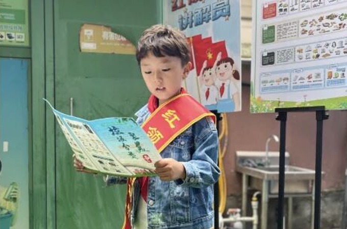在社区垃圾分类志愿服务中,徐宸希分发分类卡、张贴指引标识,还用奖励贴纸引导小朋友正确分类,用行动带动邻里践行环保理念,让文明新风浸润社区角落。