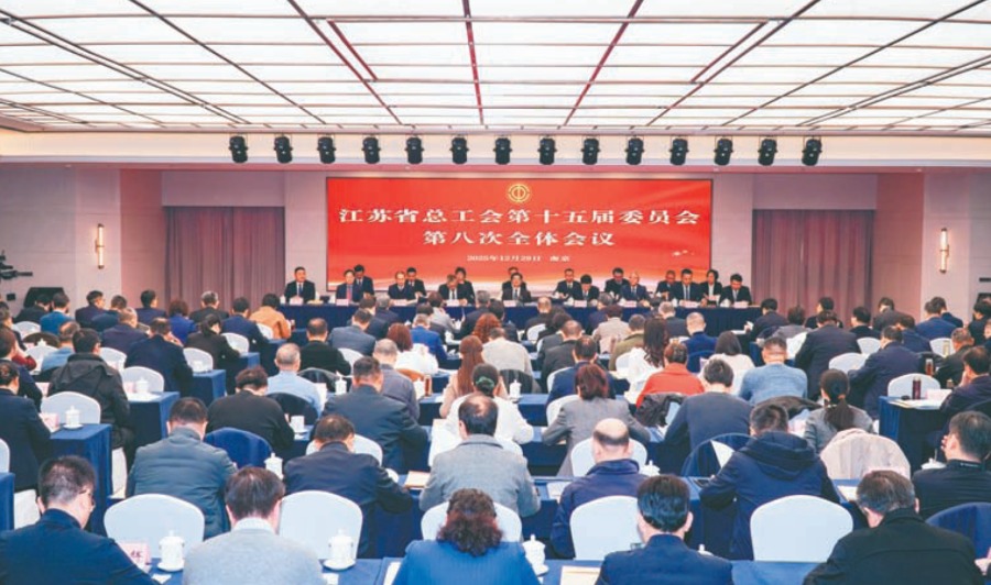 12月29日,江苏省总工会第十五届委员会第八次全体会议在南京召开。全会深入学习贯彻党的二十届四中全会精神,认真落实省委十四届十次全会要求,按照省委和全总工作部署,总结今年以来工作,部署2026年任务,就全省工会组织学习贯彻党的二十届四中全会精神,作出《关于充分发挥工人阶级主力军和工会组织桥梁纽带作用 为“十五五”时期中国式现代化江苏新实践凝聚智慧力量的决定》,进一步激发全省职工群众团结奋进的磅礴力量,为推动中国式现代化江苏新实践取得新的更大进展作出积极贡献。省人大常委会副主任、省总工会主席魏国强代表省总工会常委会作工作报告,省总工会党组书记、副主席刘月科主持会议。