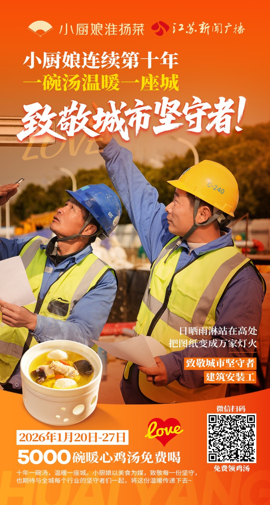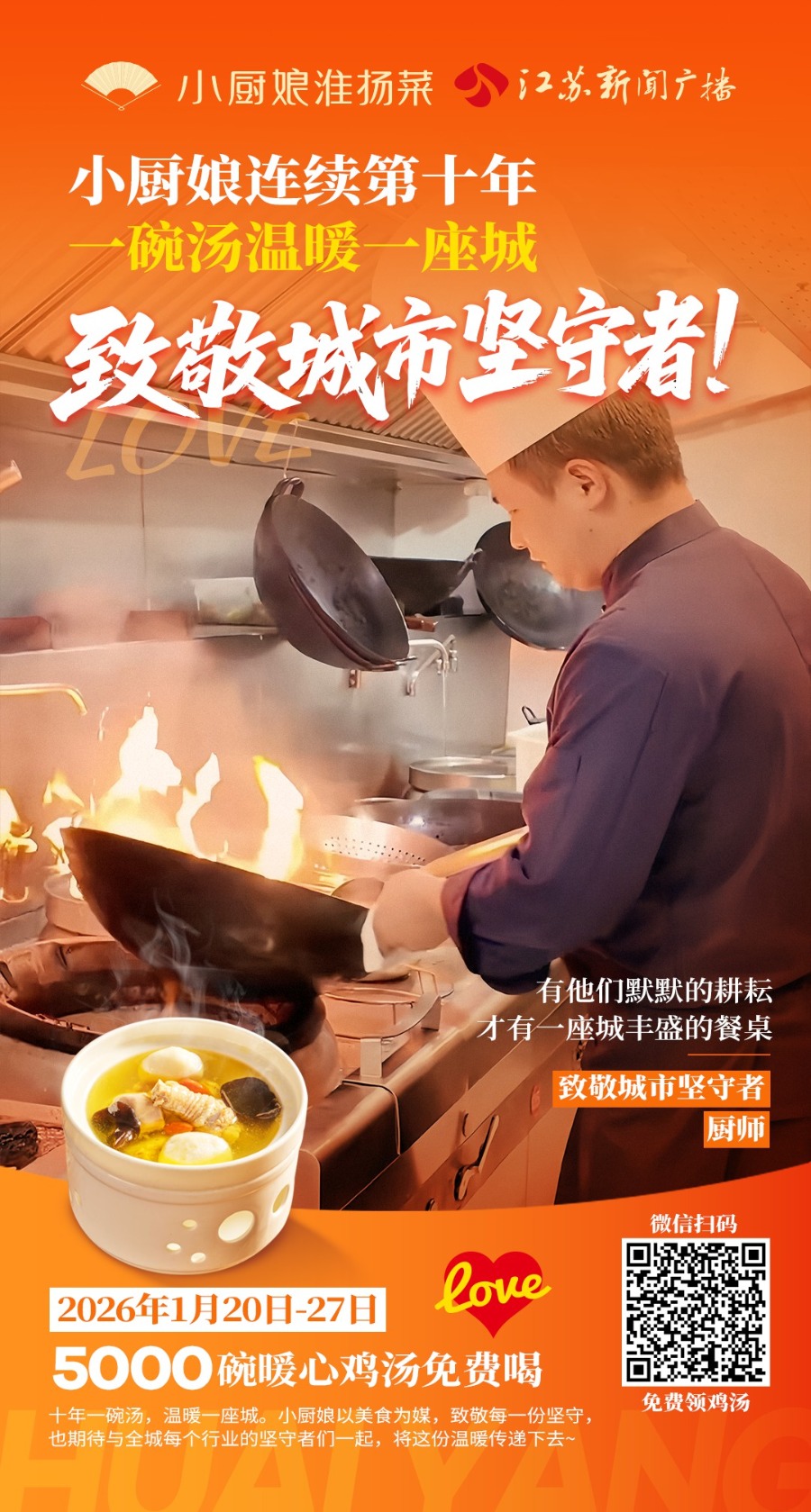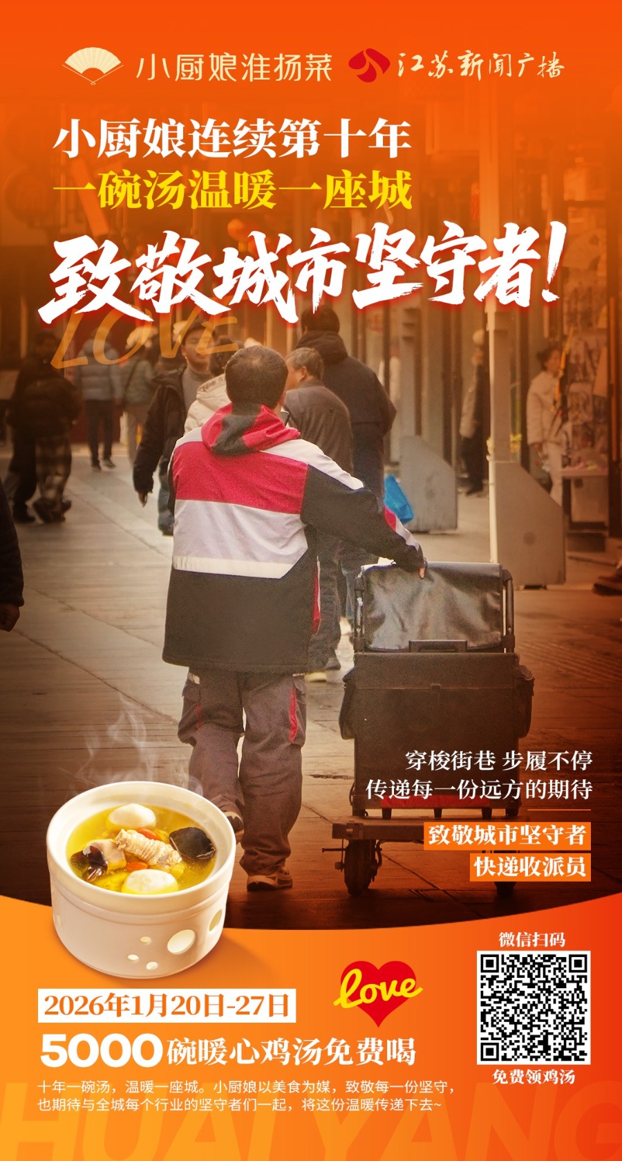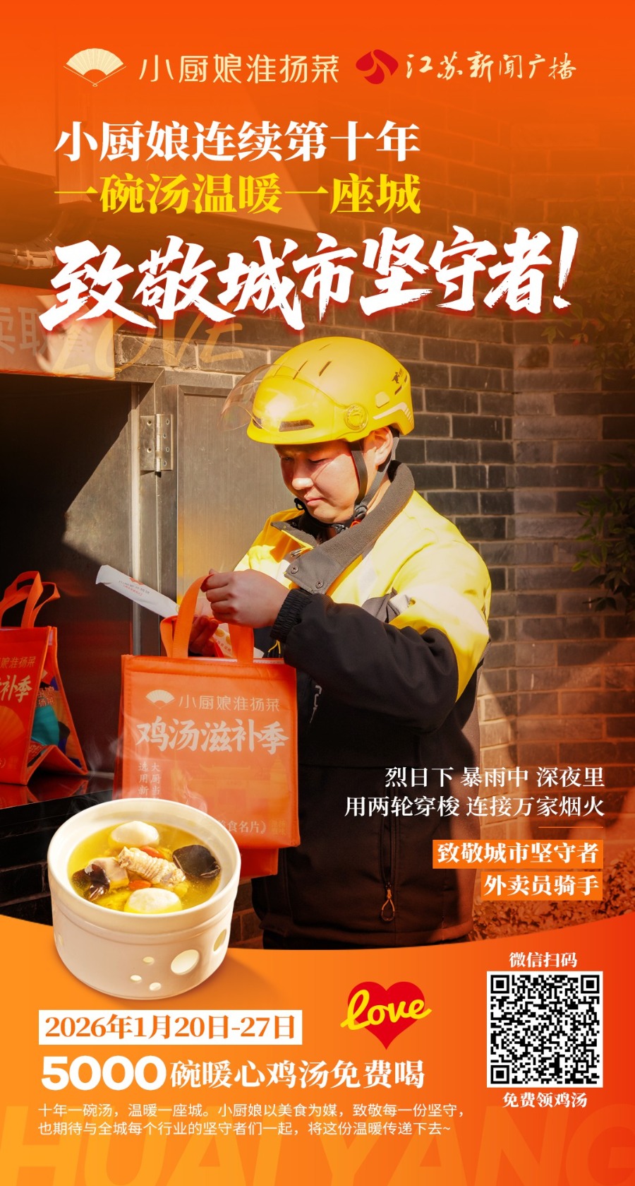 大寒时节遇大雪,暖流却在南京城中悄然传递。江苏新闻广播联合小厨娘淮扬菜发起的“暖心工程”——“一碗汤温暖一座城”如期而至。这已是小厨娘连续第十年,在大寒时节为默默付出的城市劳动者赠送精心熬制的暖心鸡汤。一碗热汤入怀,驱散了风雪的寒意,更致敬着每一份平凡岗位上的坚守。十年如一日的守护,不仅温暖了寒冬,也让这座雪后的城市,多了一份直抵人心的温度。