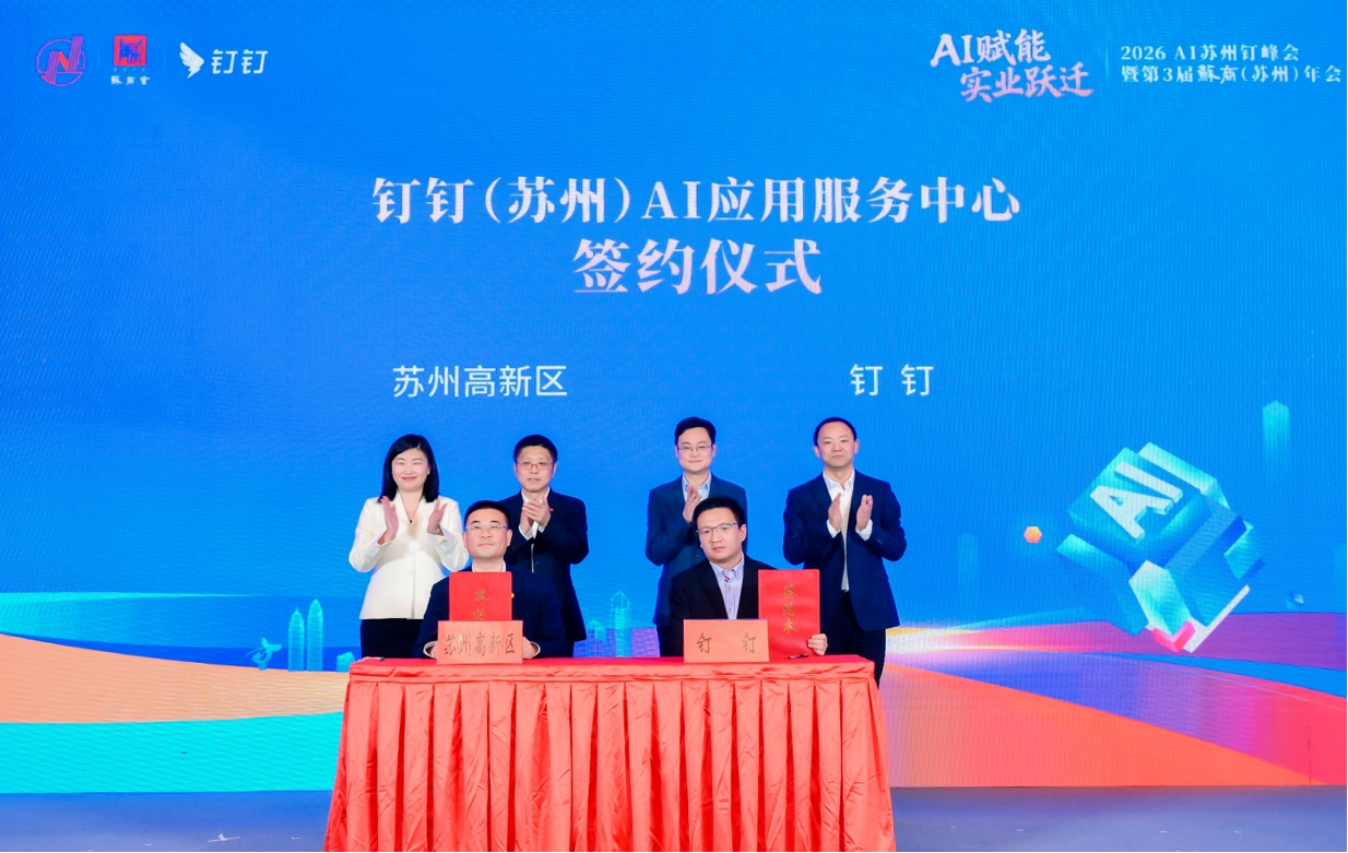 现场,钉钉(苏州)AI应用服务中心签约落地苏州高新区。作为全国首个落地项目,该中心将组建本地化专业服务团队,计划首期招聘100人,重点从开展AI应用培训、联合企业共创解决方案、共建“AI+行业”标杆示范、提供算力模型与生态交流平台等四个方向发力,精准赋能区域“AI+制造”产业升级与OPC创业者发展,为区域壮大人工智能产业生态注入硬核动能。
