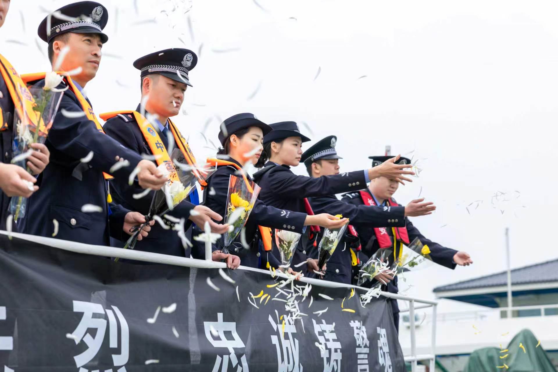 活动开始,民警们重温入党誓词,铿锵誓言在江面上回荡,一字一句坚定有力,彰显着对党忠诚、为民奉献的初心使命。伴随着江风轻拂,寄托哀思的花束缓缓撒向江面,点点漂流,仿佛将敬意与思念送往远方。通过“江祭”这一庄重形式,民警们在特殊的空间场景中接受了一次深刻的精神洗礼。