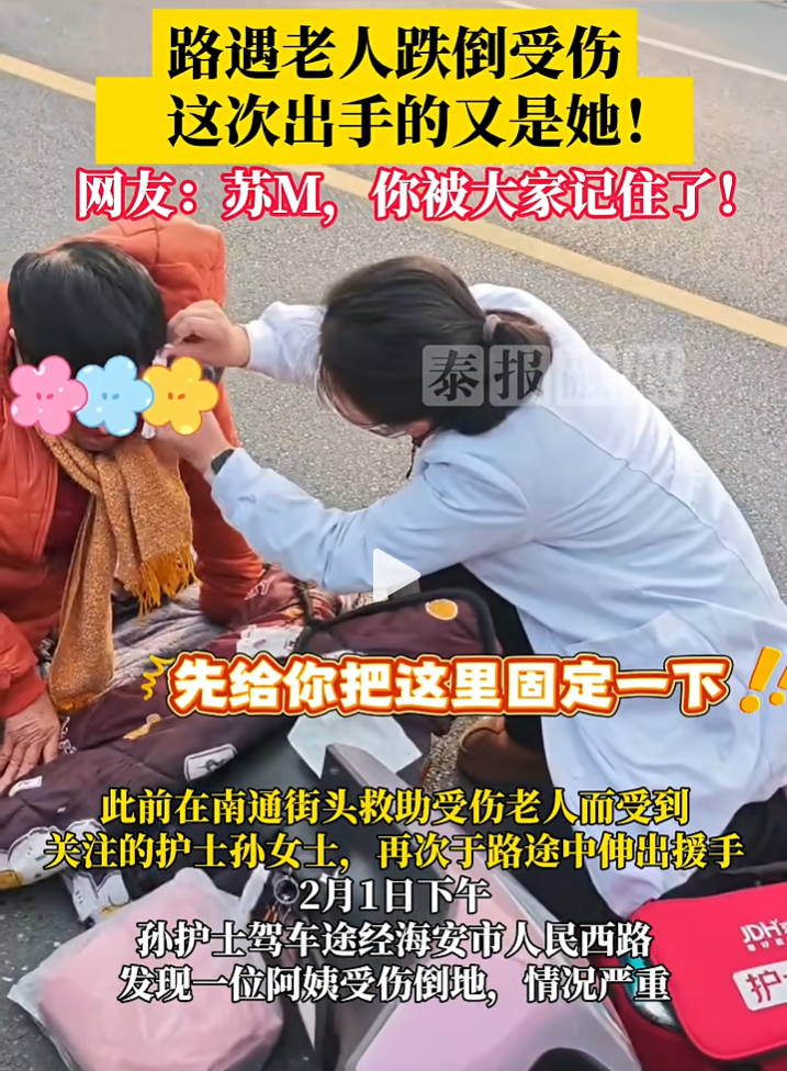 而就在十天前的1月22日,她刚刚在海安市一条路上救了一位因车祸受伤的老人。当时老人受伤倒地,额头伤口流血不止,围观群众无人敢贸然施救。孙诗卉恰好结束上门护理返程路过,她毫不犹豫地停车、挤入人群、亮明护士身份,从随身携带的护理包中取出急救用品,有条不紊地为老人止血包扎,守护到救护车抵达后才默默离开。