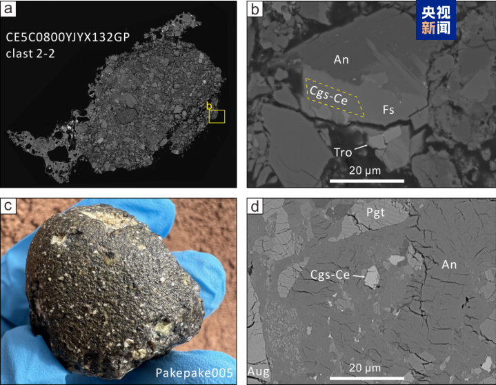 △a: 嫦娥五号月壤;c: Pakepake005月球陨石;b,d: 铈嫦娥石及其共生矿物